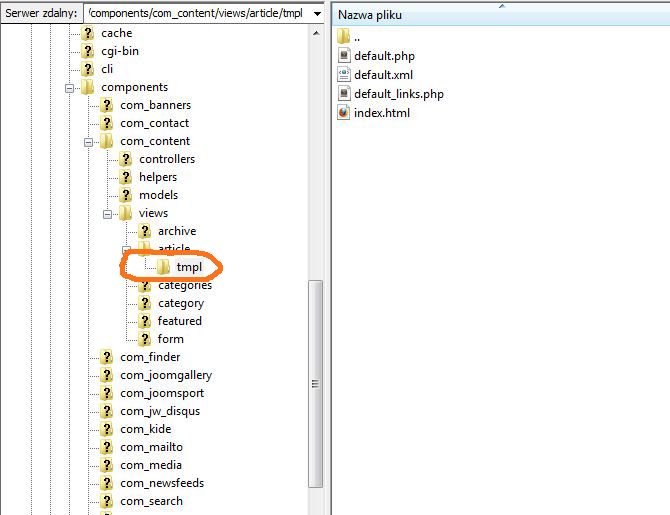 Widok znajduje się w pliku default.php. Kopiujemy go do odpowiedniego katalogu w katalogu szablonu. W tym przypadku to będzie: html/com_content/article/.
